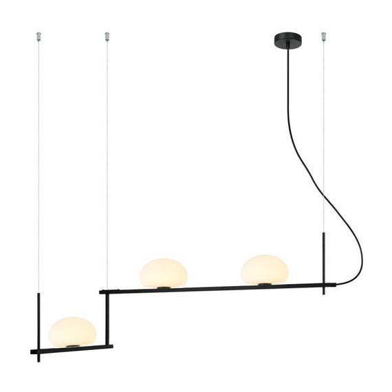 - Lampa wisząca Kernio z firmy Italux charakteryzuje się wyrazistym kształtem w kolorze czerni, posiada trzy mleczne klosze, które równomiernie rozprowadzają światło. Lampa pięknie oświetli wybraną przestrzeń.